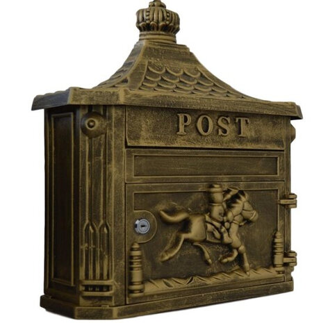 U zoekt een brievenbus met een authentieke uitstraling? Wat vindt u van deze nostalgische brievenbus? Deze elegante wandbrievenbus is gemaakt van gietaluminium en leverbaar in een aantal mooie kleurstellingen. De postkast heeft die authentieke, sfeervolle en statige uitstraling waar velen naar op zoek zijn. Bovenop de letterkast zit een kroontje en op de voorkant staat een 3D prent van een bezorger op paard. Op de brievenbusklep staat met 3bolle letters het woord 'post' geschreven. De klassiek uitziende brievenbus staat prachtig aan zowel de wand van een jaren 50 huis als aan de muur van een modern nieuwbouw of herenhuis!